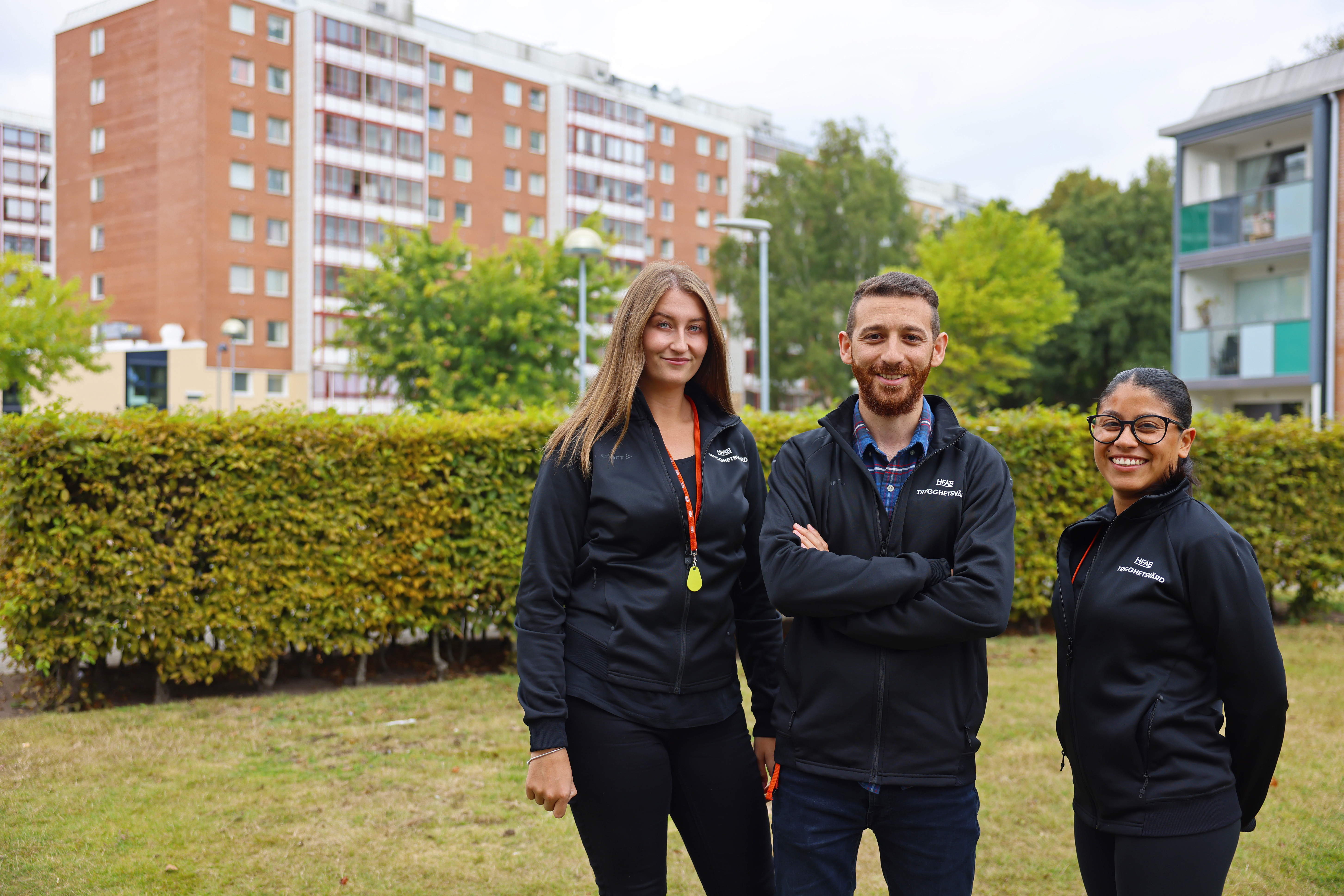 Vania Eriksson, Natalie Cadjo och Mahmoud Anara är HFAB:s allra första trygghetsvärdar. Kollegorna har varit i tjänst i snart en och en halv månad. Tillsammans har de fokus på att möta hyresgäster, skapa aktiviteter och bidra till en mer levande och trygg miljö.