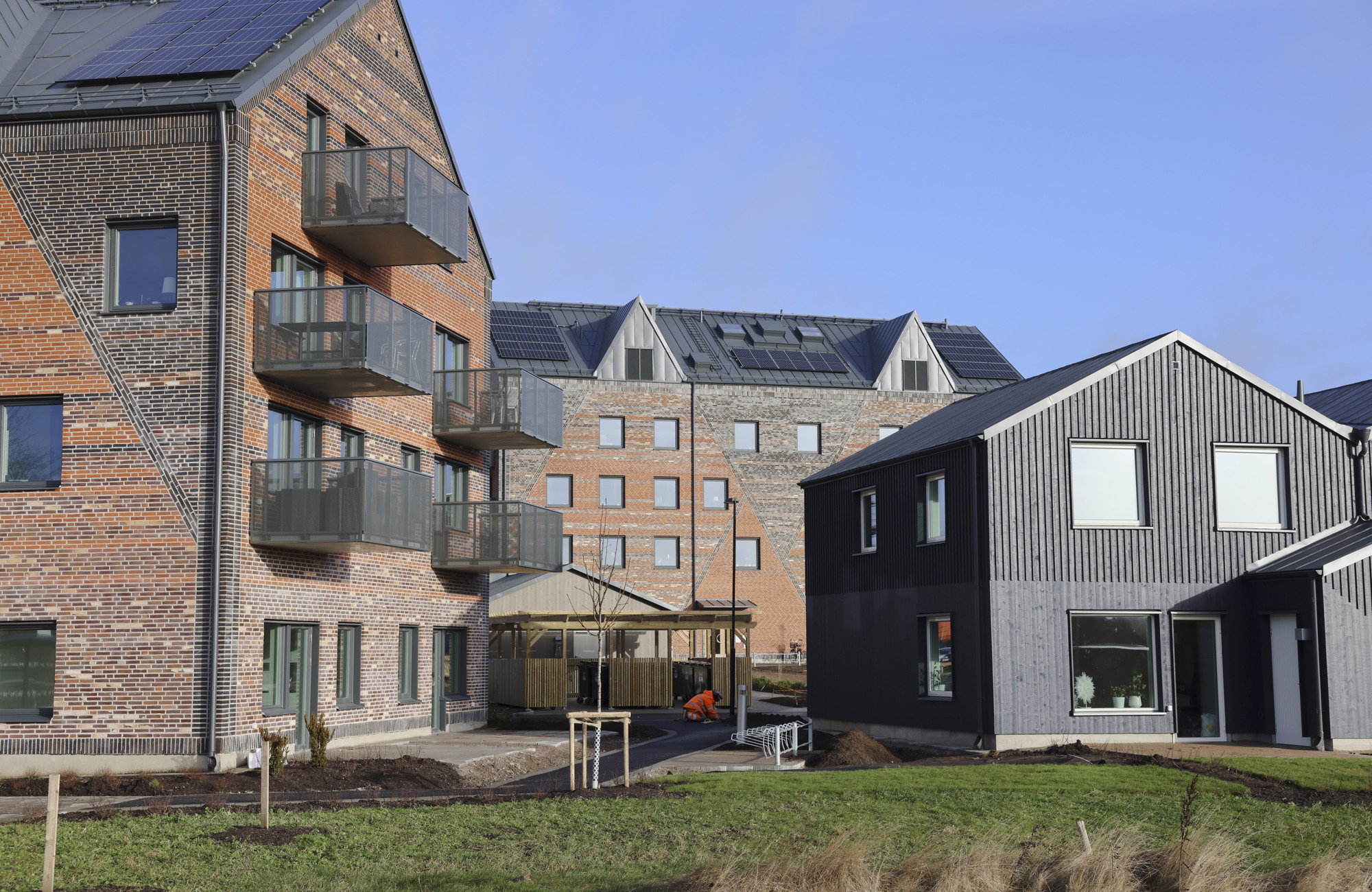 På samma gata ligger våra flerbostadshus som har vackra fasader i tegel och branta plåttak. Husen smälter vackert in i det moderna och naturnära området, samtidigt som de sticker ut med sin unika gestaltning.