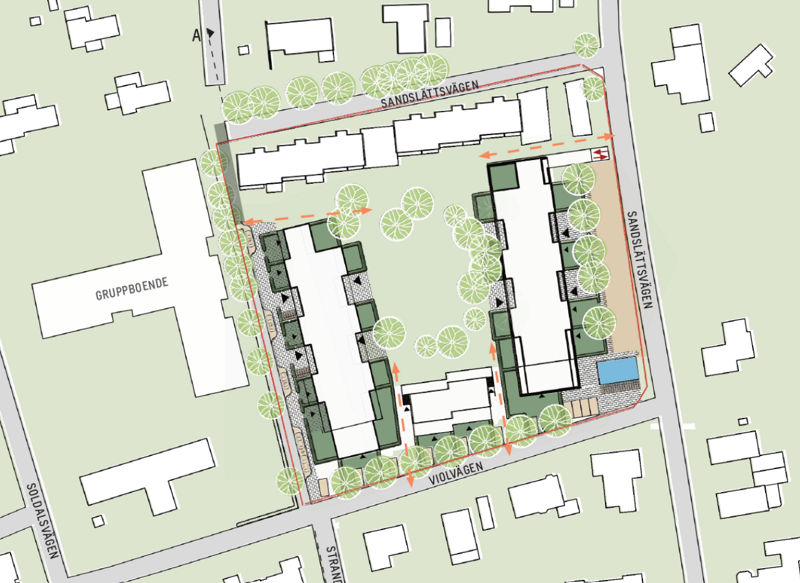 Här vill vi bygga moderna och tillgängliga lägenheter som ett attraktivt alternativ till hus och radhus. Vi vill behålla den befintliga bebyggelsen i två våningar i områdets norra del och komplettera med nya bostäder i olika storlekar. På så sätt skapas en bra mix av bostadstyper som tar hänsyn till både platsens kvaliteter och omgivningen.